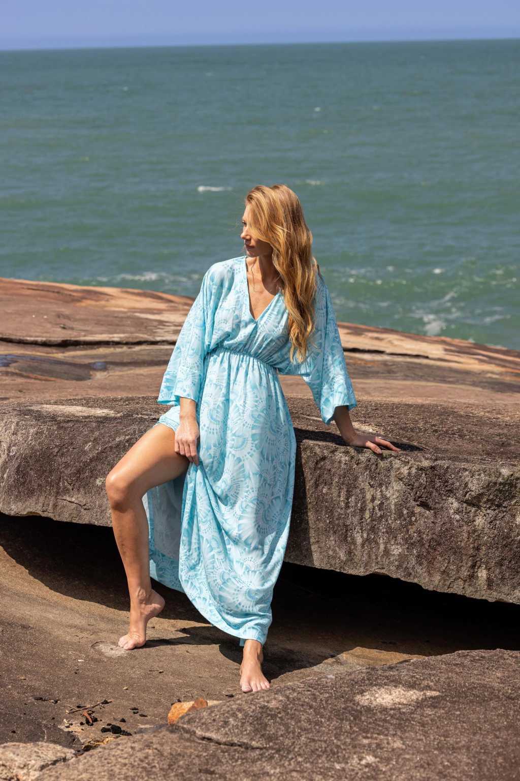 Descubra o Kaftan Elyra, a peça perfeita para quem busca elegância com conforto em dias quentes. Com tecido leve e fluido, este kaftan traz uma estampa delicada e exclusiva, que remete à serenidade do mar, ideal para momentos de lazer na praia ou passeios ao ar livre. Seu design com decote em V e cintura marcada valoriza a silhueta de forma feminina e sofisticada.